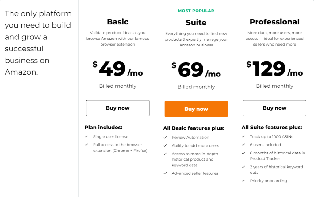 Helium 10 and Jungle Scout both offer appealing pricing plans suited for various types of sellers. Let’s compare them to determine which one offers better and more reasonable options.